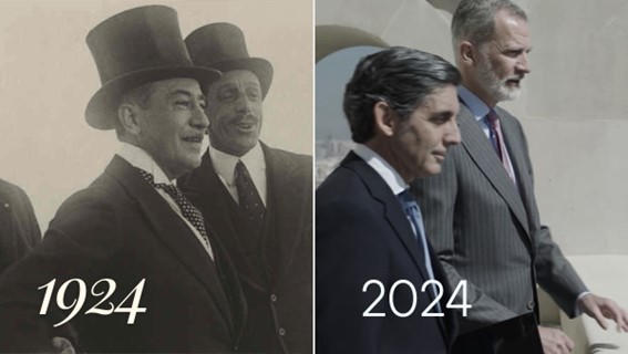 *Foto: Telefónica. Imagen del rey Alfonso XIII junto al primer presidente de la compañía, Estanislao de Urquijo y Ussía; y del actual rey Felipe VI junto al actual presidente. José María Álvarez Pallete, ambas tomadas en el edificio de Telefónica en la Gran Vía madrileña