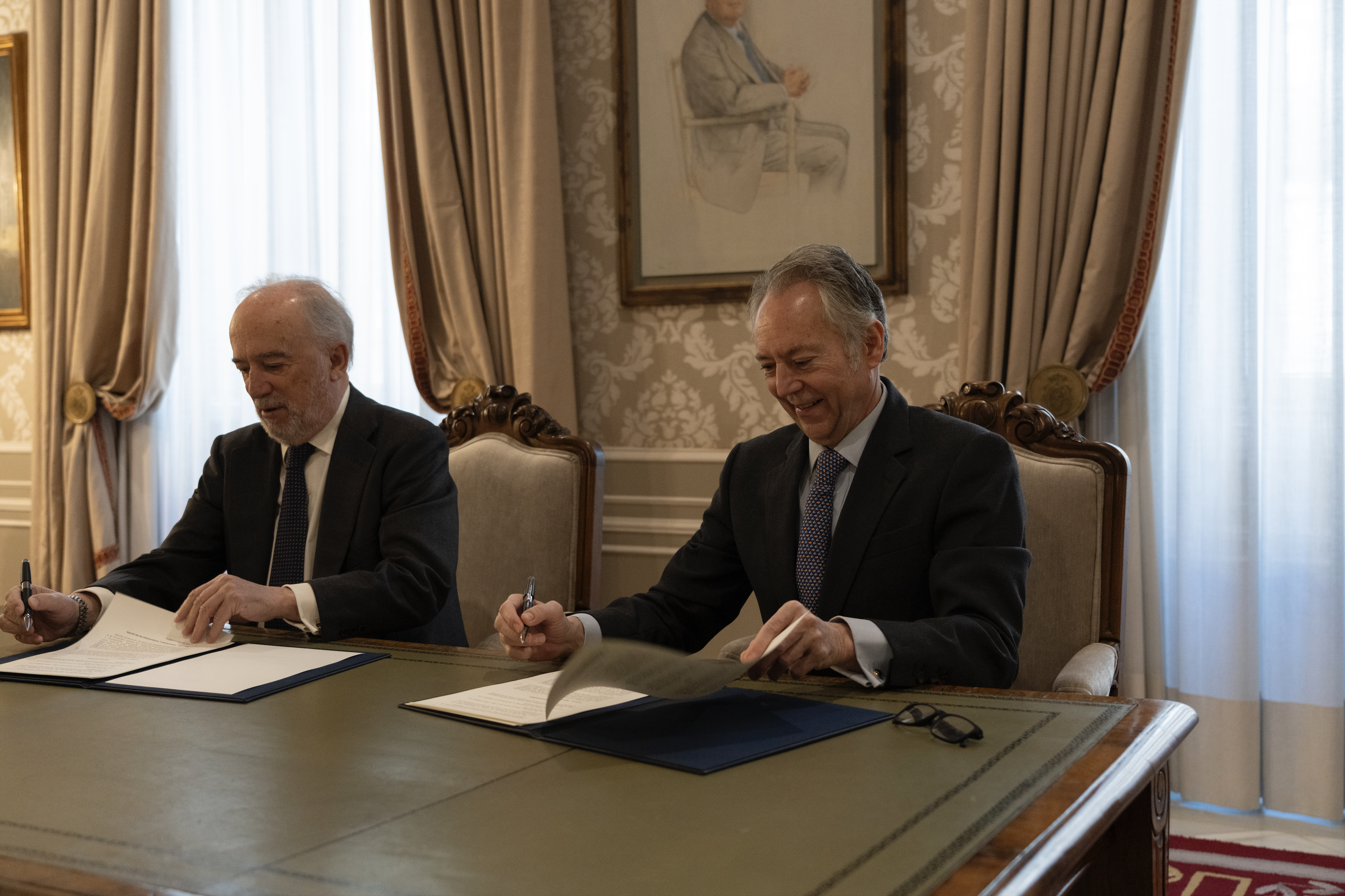 La firma del acuerdo se llevó a cabo por D. Santiago Muñoz Machado, director de la Real Academia Española, y D. José Joly Martínez de Salazar, presidente de la Asociación de Medios de Información.